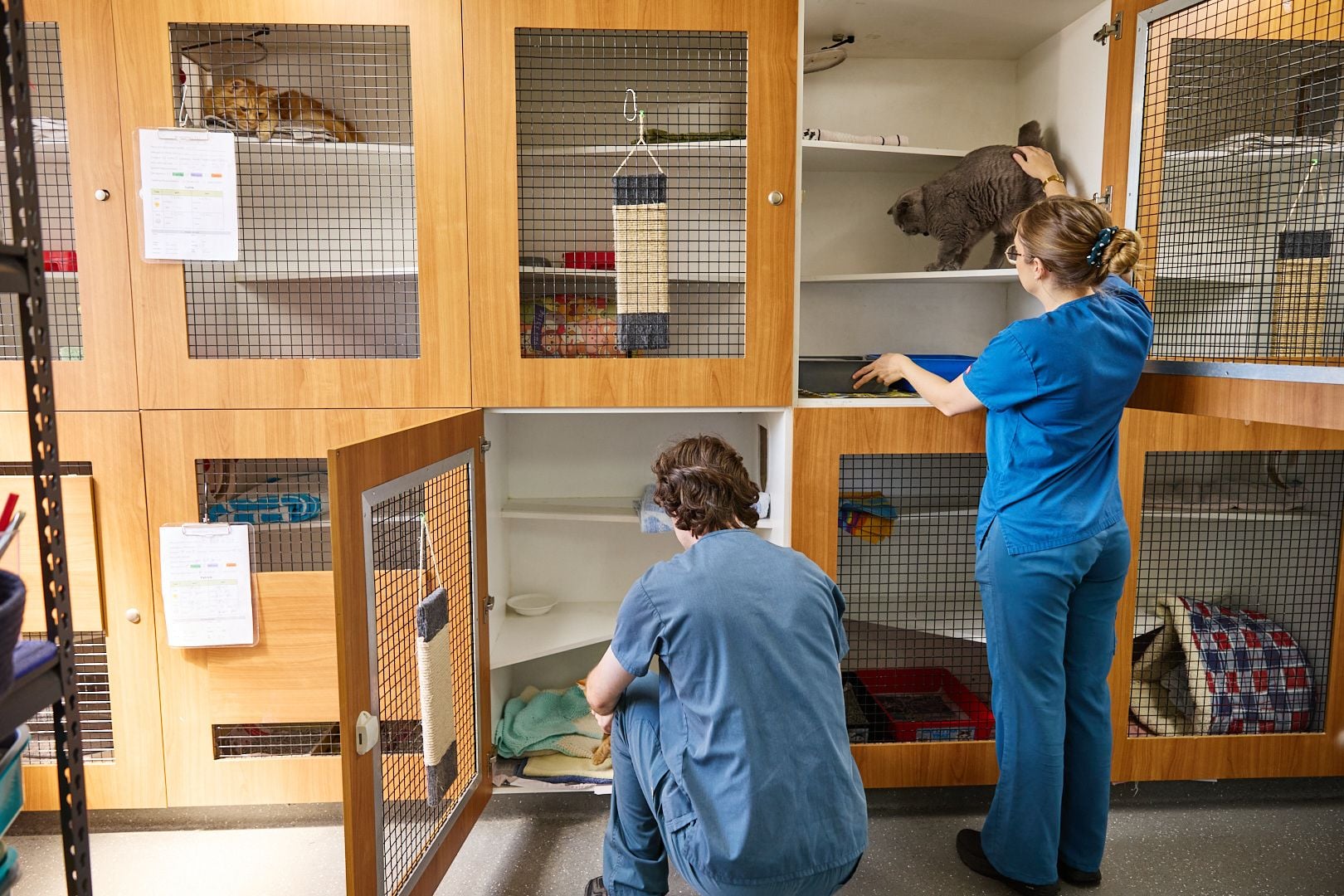 Our cat boarding ward has the resources to house cats (separate from dogs and other hospital patients). Cats are kept in two-level cages and released periodically to roam about and stretch their legs.